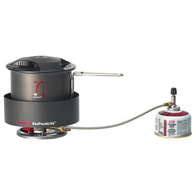 NJORD 2 BURNER STOVECompact, easily collapsible design with ultra efficient 7150 BTU/h LP burner for superfast 2.5 minute boiling time. Includes base, burner with piezo igniter, windscreen, 1.2 liter heat exchanger pot with 3 layer titanium non-stick coating and sturdy colander lid and hygienic protector/serving bowl. Weight 21 oz./ 596 g.