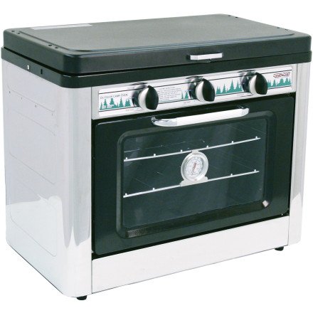 Camp Chef Outdoor Camp Oven 2 Burner Range and Stove . You've always wanted an oven when camping - Now you can with the Outdoor Camp Oven. Don't let its compact size fool you. The Outdoor Camp Oven features over 14,000 total BTU's, the twin burners and spacious oven have plenty of power to get your cooking/baking done right. This stove's folding lid and carrying handles were designed with portability in mind. This camp oven is loaded with features. It is just perfect for your cabin, summer camping, or RV. Pefect for muffins, cookies, casseroles, and Dutch oven dishes. In charge of girls camp this year? Simplify your life with the Outdoor Camp Oven. Style number C-OVEN