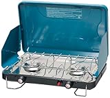 The Stansport Deluxe Two Burner Stove in Black features two 12,000 BTU's 3.25" burners, a high altitude pressure regulator and the Piezo igniter for matchless lighting. It also has a heavy duty pot or pan rack and a stainless steel drip pan. It's 18" length is compact for easy transport and portability. It uses a 16.4 oz disposable propane gas cylinder (NOT INCLUDED).