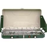 Piezo ignition system, no need for matches. High pressure/high altitude pressure regulator. Baked enamel finish on heavy gauge steel. Two high output 10,000 BTU capacity burners. Stainless steel drip pan. Heavy-duty double strength cooking rack. Extra large 22 in. wide x 10 3/4 in. cooking surface. Uses 16.4 oz. propane - not included.