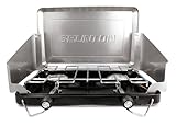 New 2 Burner Camping Stove, made from durable steel construction, with built-in windscreens for higher performance and efficiency. 10-12000 BTU's stainless burners in a slim and compact design for easy carry and storage. Customer Care at 1-800-443-4871 or www.brunton.com