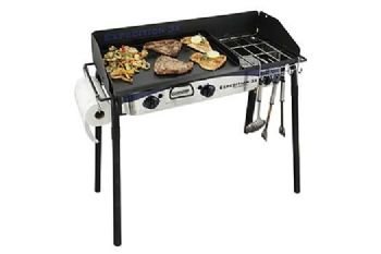 Introducing Camp Chef's biggest, most powerful outdoor appliance. The Expedition 3x. With three 30,000 BTU/hr burners, this stove is great for any occasion. Each burner produces three times the heat of a burner on your kitchen stove: To add versatility, we have included our awesome "true-seasoned" steel griddle. The 24 x 18 inch Deluxe Fry Griddle features restaurant style high sides and convenient grease drain. It fits over two burners. The heat skirt provides even heat distribution. Because this griddle comes with Camp Chef true-seasoned finish, it is ready to use right out of the box. Griddle works great for stir-fry's, fajitas, breakfasts, steaks, etc: To top off the package we have included a three-sided windscreen to help keep the flame burning strong and a paper towel holder and a utensil holder for your stove to keep your shelves free from clutter. With this package you should be able to cook anything - anywhere - anytime just like you would at home: Features: Three high capacity 30,000 BTU burners. Includes true seasoned steel 24"" x ""18 Griddle. Includes paper towel holder. Includes utensil holder. Windscreen. Product Specifications: Stove Dimensions: 38"" x 16 1/4"". Cooking Area: 573-square inches. Height: 30"". Total Output: 90,000 BTU. Weight: 47 lbs. Warranty: One Year.